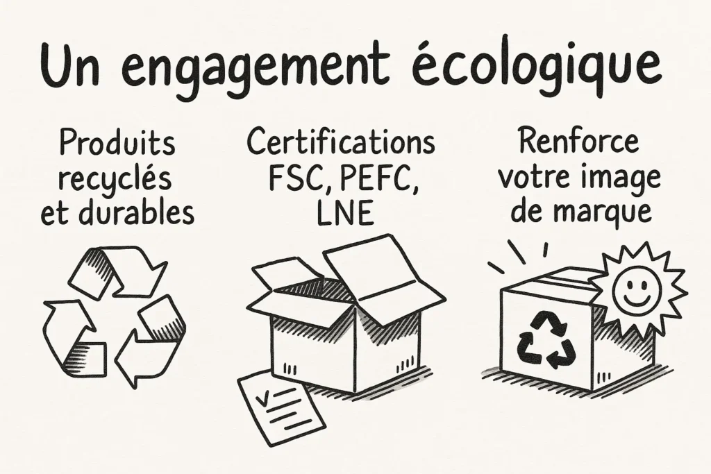 • L’entreprise met en avant une démarche écoresponsable sérieuse, avec sa gamme Packagreen, des emballages recyclés, des certifications reconnues (FSC, PEFC) et une réduction de l’impact environnemental.